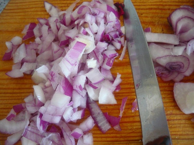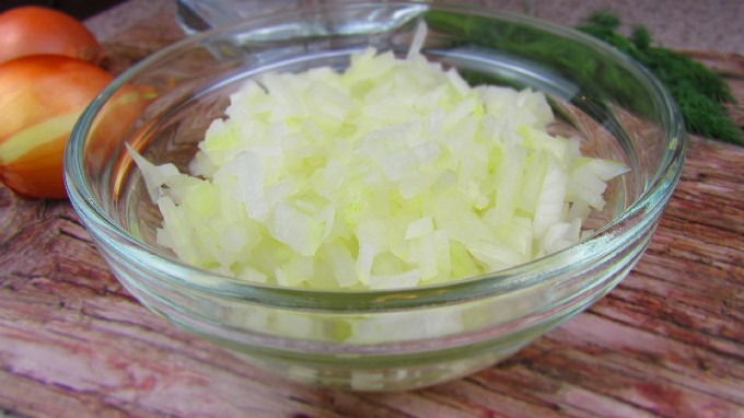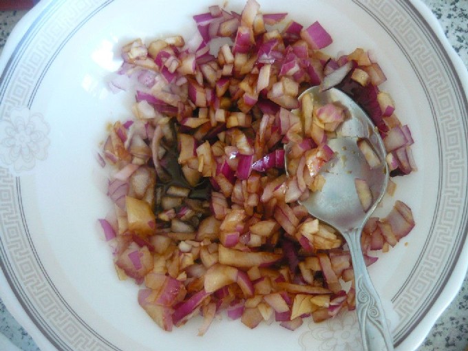 - Doe de uien in een diepe kleine kom en besprenkel met de sojasaus om te marineren. In plaats van sojasaus kun je ½ theelepel nemen. azijn verdund in een lepel gekookt water.