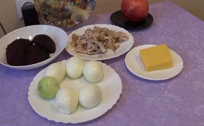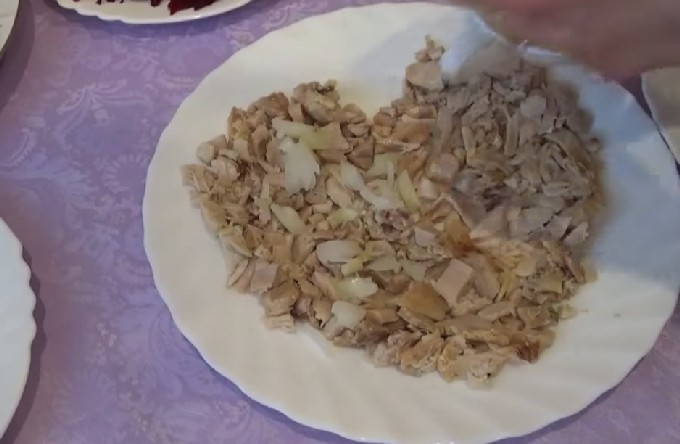 - Kook de kipfilet in licht gezouten water, indien gewenst kun je lavrushka en peperkorrels in het water doen. Kook de bieten en laat afkoelen, rasp ze op een middelgrote rasp. Pel de ui, hak ze fijn en bak ze samen met de champignons in olie.