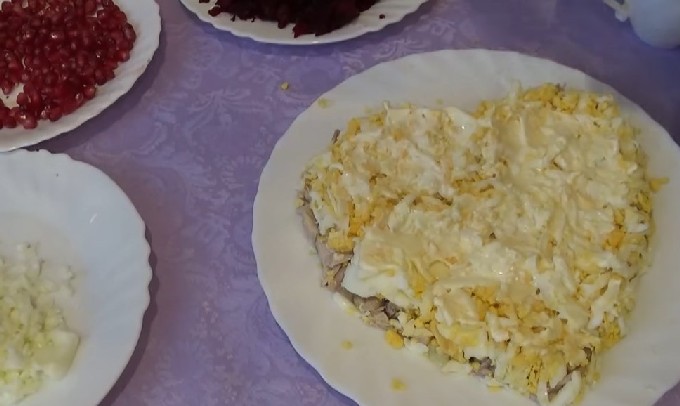 - Maal eieren grof op een rasp, meng met 1 el. ik. mayonaise en smeer in de derde laag.