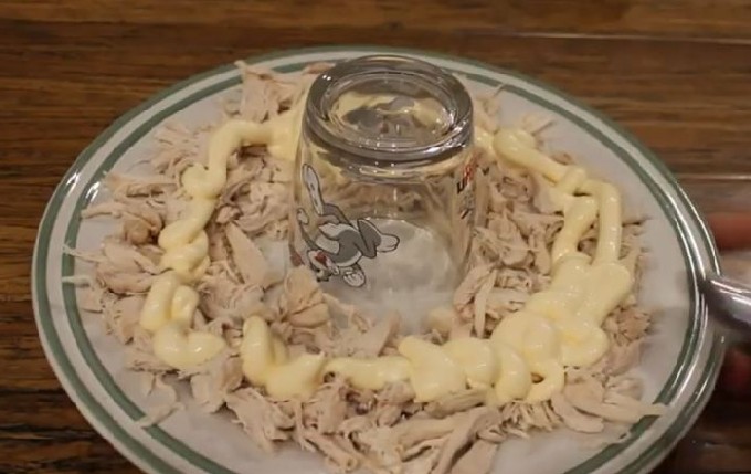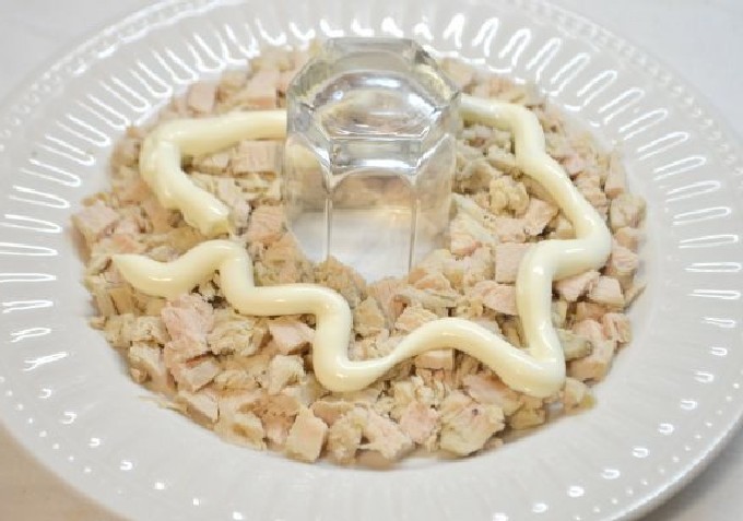 - Zet een glas in het midden van een breed bord. Snijd de gekookte kipfilet in blokjes, spreid deze met een armbandje om het glas en bedek met reepjes mayonaise.