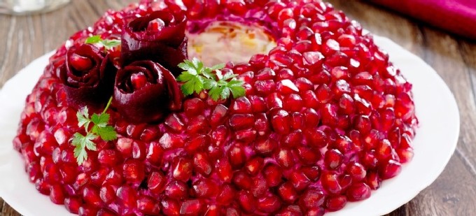 - Heerlijke salade "Granaatappelarmband" met champignons en kip