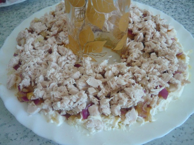 - Snijd de kip, vooraf gekookt en afgekoeld, in kleine stukjes. Leg hartvormige stukjes kip en uien op een plat bord. Bestrijk alle kanten met een laag mayonaise.