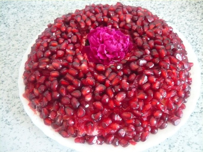 - Bestrooi de zijkanten met de gehakte eiwitten met een mes, leg de granaatappelpitjes erop en strooi ze willekeurig over de schaal. Zet 2 uur in de kou. Voeg indien gewenst groen toe.