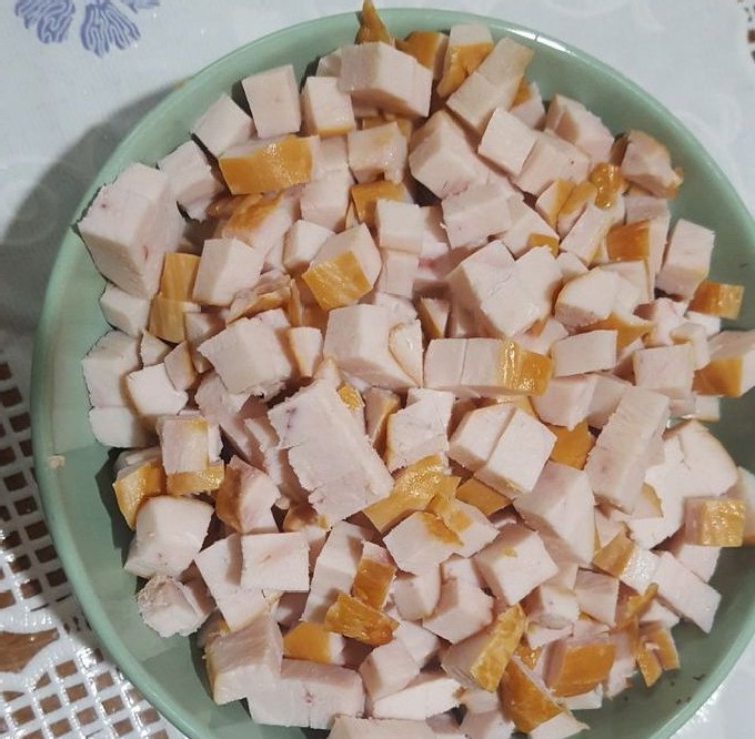 - Snijd het vlees van gerookte kip in grote blokjes. Schil de ui en, in blokjes gesneden, bak in een koekenpan tot ze goudbruin zijn, breng over naar een aparte schaal.