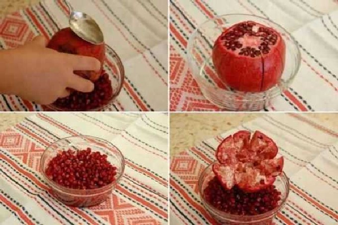 - We maken de granaatappel schoon, selecteren de heldere korrels en verspreiden ze over het hele oppervlak van de salade. U kunt kinderen of gezinsleden bij het proces betrekken. Hoe dichter de bovenste laag, hoe spectaculairder en sappiger de salade eruit zal zien.