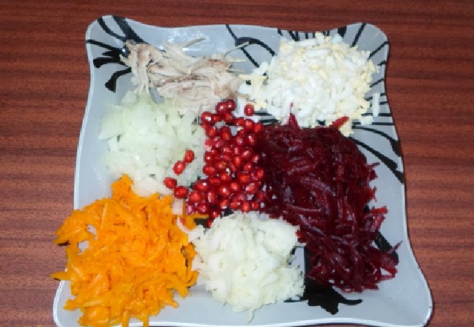 - Rasp de bieten op een middelgrote rasp. Hak de knoflook fijn.Combineer de knoflook en bieten en leg deze op de salade. We bedekken deze laag niet met mayonaise, maar strooien er meteen de granaatappelpitjes op in een zeer dichte laag. Laat 2 uur in de kou staan om te weken.
