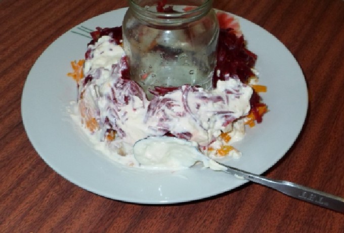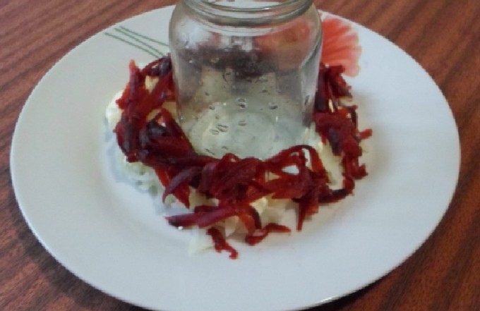 Neem een plat breed bord en plaats in het midden een pot of glas van een halve liter. Leg een laag aardappelen rond de pot, zout, peper licht en bedek met mayonaise. Leg de helft van de bieten, mayonaise erop, dan wortelen en bestrijk ze met mayonaise.