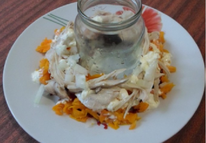 - Zet een glas in het midden van een plat bord. Rasp gekookte aardappelen en leg ze bij de eerste laag salade. Werk af met mayonaise.