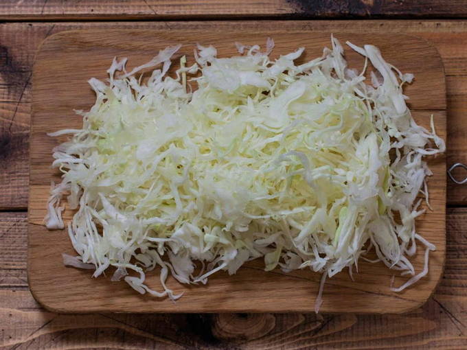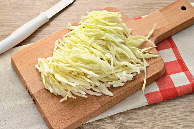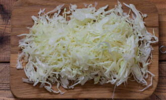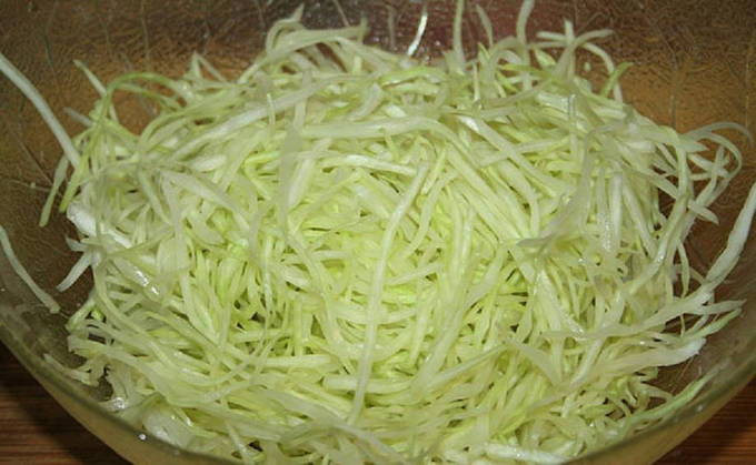 Laten we beginnen met kool. We verwijderen de bovenste bladeren en spoelen grondig onder stromend water. Droog het vervolgens af met een papieren of katoenen handdoek. Hak het nu fijn met een mes of gebruik een keukenmachine. Vergeet niet de stronk af te snijden. Breng de gesneden kool over in een diepe kom.