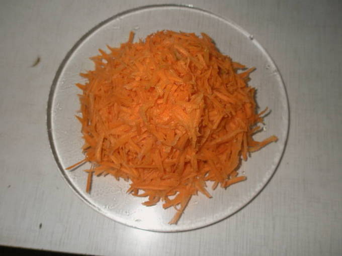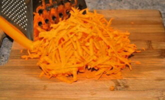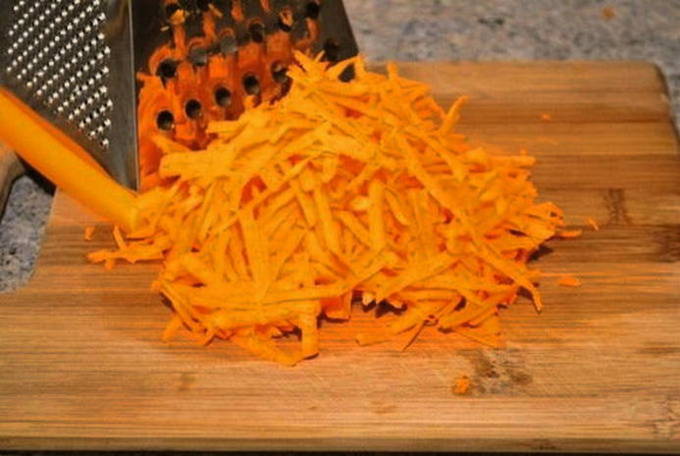- Schil de ui en snijd hem in halve ringen van gemiddelde dikte. We schillen ook de wortelen en raspen ze op een grove rasp, of hakken ze fijn met een mes.