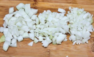 Pel de ui en snij in kleine blokjes. We brengen het over naar een container met de rest van de groenten.