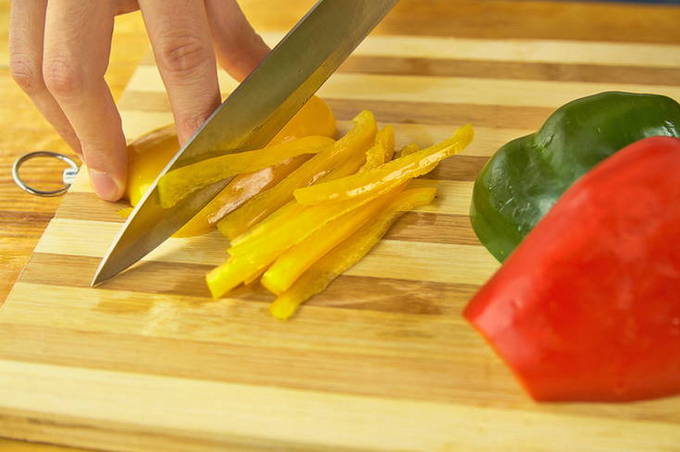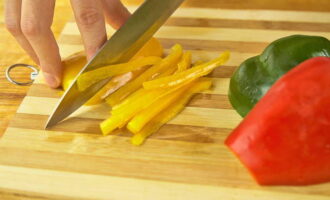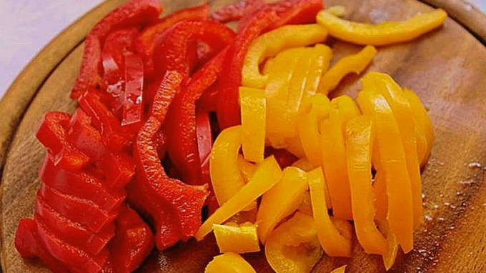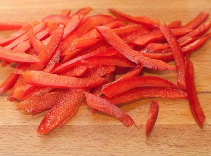 - We wassen de paprika onder stromend water, verwijderen de stelen met zaden en snijden hem in halve ringen of veren.