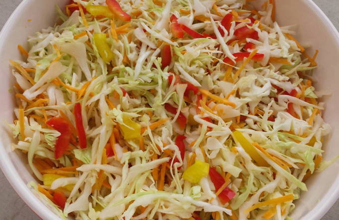 Salade van kool, paprika, wortel en uien met azijn voor de winter