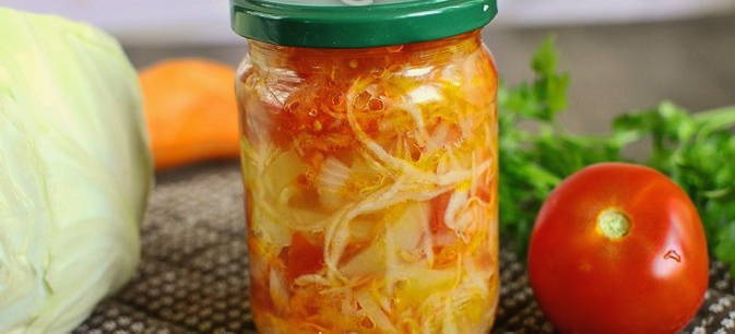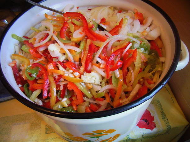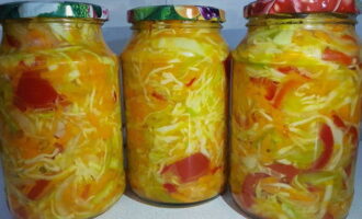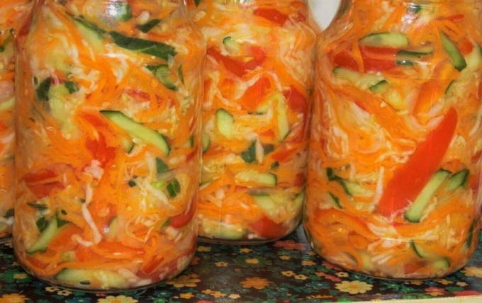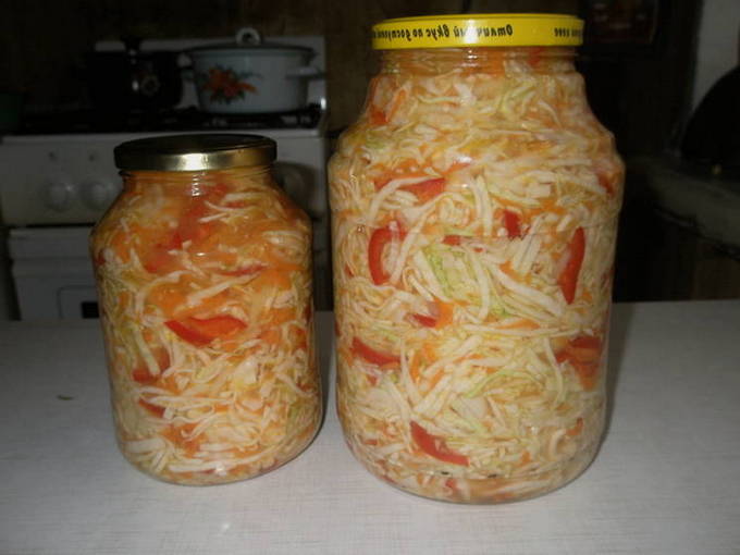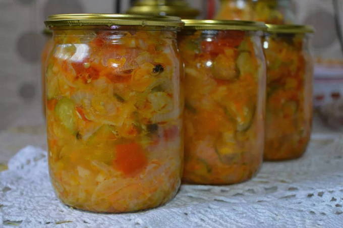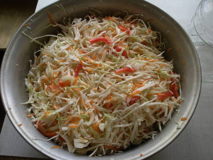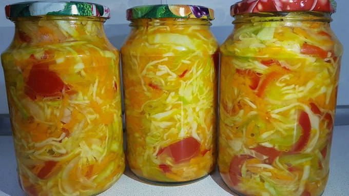 Suiker, zout, plantaardige olie en azijn worden toegevoegd aan gesneden kool, wortelen, uien en paprika's. Alles wordt in schone blikken neergelegd, gesteriliseerd en opgeslagen. Het blijkt een zeer smakelijke en vitaminerijke salade te zijn.