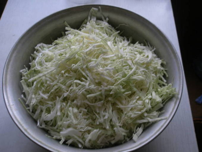 - Maak eerst de kool klaar. We verwijderen de bovenste bladeren, spoelen onder stromend water en drogen op een papieren of katoenen handdoek. Hak het vervolgens fijn, breng het over in een geschikte container, voeg de helft van het totale volume zout toe en kreuk het lichtjes met je handen. Nu leggen we het opzij zodat de kool het sap begint te maken.