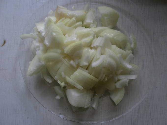 - Schil de ui, snijd hem in middelgrote stukken en stuur hem naar een kom met gehakte kool.