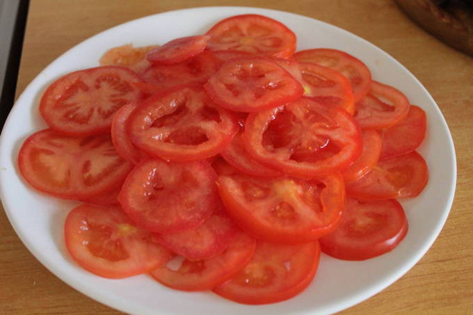 - Snijd de gewassen tomaten in plakjes zoals bij een groentesalade. Gebruik bij voorkeur vlezige vruchten zodat ze in de afgewerkte Kuban-salade zoveel mogelijk hun vorm behouden.