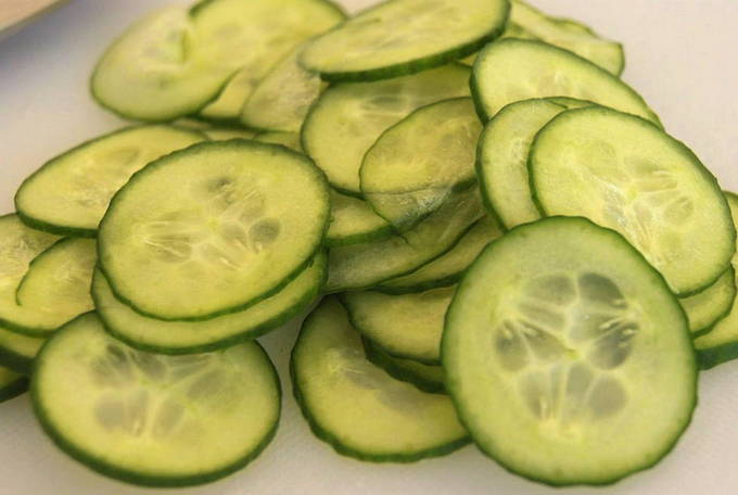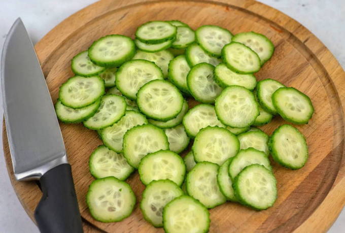 - We wassen ook de komkommers en snijden ze in dunne plakjes.