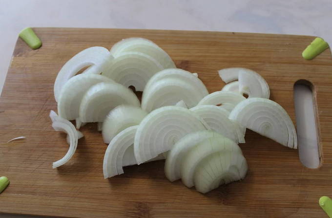- Pel de uien en snij in halve ringen. We sturen het naar de rest van de groenten.