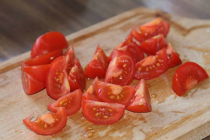 - Was de tomaten en snijd ze in middelgrote stukken. We voegen ze toe aan de pan.