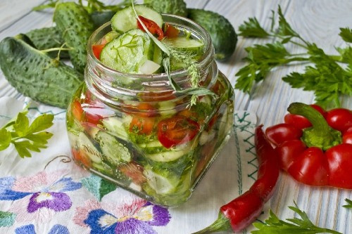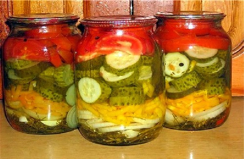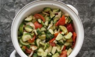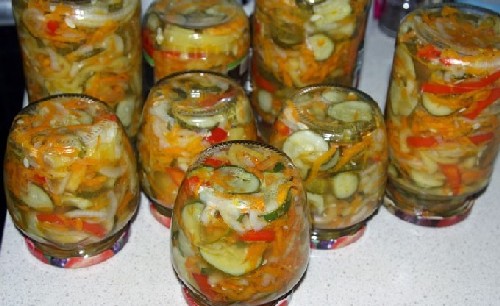 In dit recept speelt elke groente zijn onvervangbare rol: de tomaat geeft de karakteristieke zuurheid, de komkommer geeft de stevigheid en knapperigheid en de courgette geeft de consistentie van de salade zachte malsheid.De salade wordt niet gesteriliseerd, maar direct na het stoven in schone potten gelegd en opgerold.