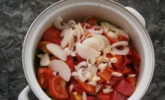 - Leg de groenten vervolgens in lagen. Kies zelf de volgorde van leggen, het is belangrijk dat de lagen elkaar meerdere keren afwisselen. Je hoeft groenten niet in een pot aan te stampen, maar het is de moeite waard om de lagen een beetje dichtheid te geven.