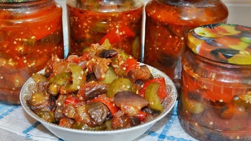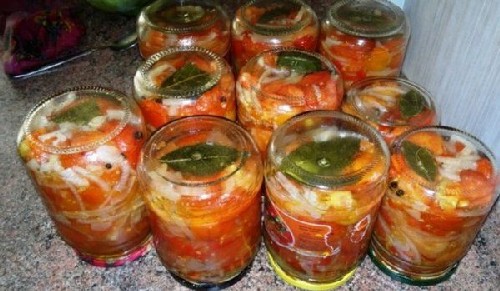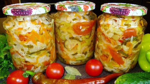 - Verdeel de salade in gelijke porties over de potten en start het sterilisatieproces. Zet de blikken in een bak met water en houd ze na het koken 20 minuten in brand (voor blikken met een inhoud van 1 liter). Rol de blikken onder de deksels en laat ze afkoelen. Bewaar op een koele plaats.