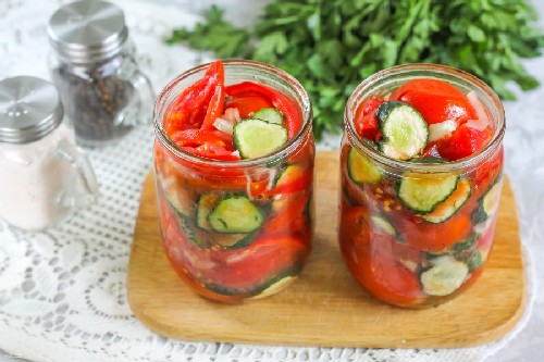 De salade voor dit recept hoeft niet te worden gesteriliseerd, omdat de groenten worden gekookt voordat ze in potten worden geplaatst. Het kookproces duurt niet lang, dus komkommers en tomaten blijven bijna net zo vers, vallen niet uit elkaar en dankzij conserveermiddelen - azijn, zout en suiker - worden ze lang bewaard.