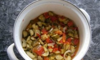 - Doe groenten in een pan, voeg zout en suiker toe, voeg plantaardige olie toe. Zet de pan op het vuur, breng het mengsel aan de kook en laat 25-30 minuten sudderen op middelhoog vermogen.
