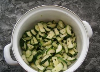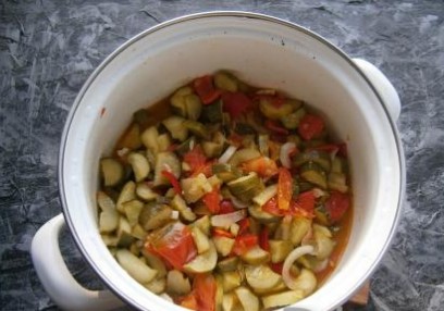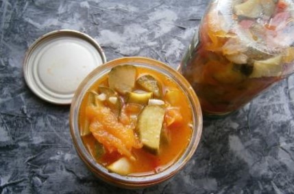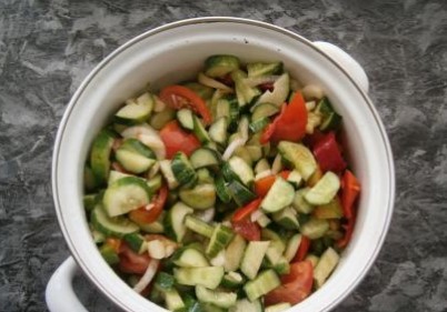 In dit recept speelt elke groente zijn onvervangbare rol: de tomaat geeft de karakteristieke zuurheid, de komkommer geeft de stevigheid en knapperigheid en de courgette geeft de consistentie van de salade zachte malsheid.De salade wordt niet gesteriliseerd, maar direct na het stoven in schone potten gelegd en opgerold.
