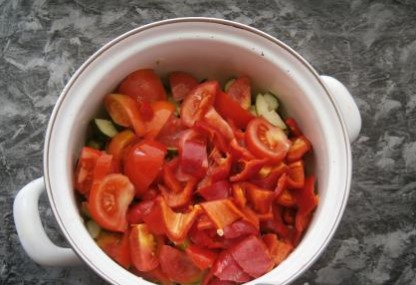 - Groenten kunnen met elkaar worden gemengd en in gelijke porties in potten of gelaagd worden verdeeld. Ze passen strak genoeg, maar stampen niet aan. Er moet aan worden herinnerd dat er ruimte moet zijn voor conserveermiddelen: azijn, zout, suiker, enz.