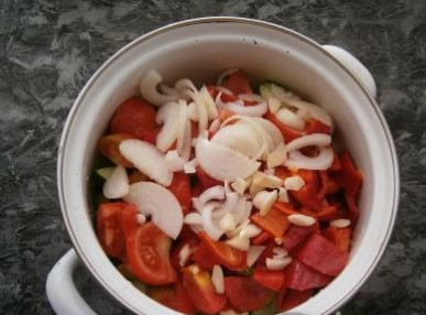 - Doe groenten in een pan, voeg zout en suiker toe, voeg plantaardige olie toe. Zet de pan op het vuur, breng het mengsel aan de kook en laat 25-30 minuten sudderen op middelhoog vermogen.