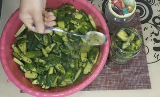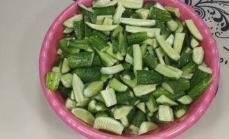 - We nemen komkommers en wassen ze. Snijd de uiteinden af en snijd elke vrucht in dunne plakjes. We stoppen het in een grote container.