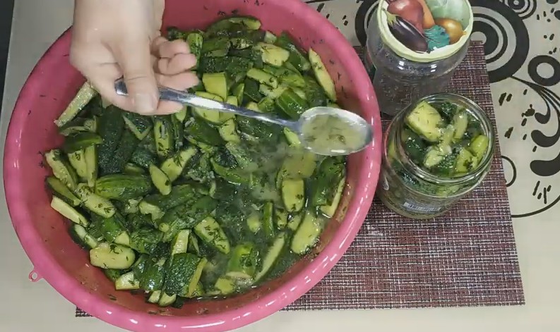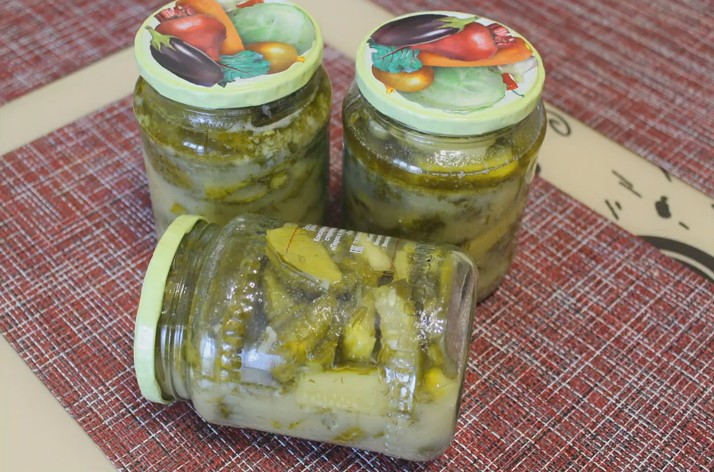 Bij het bereiden van deze salade hoeft u niet een paar uur te wachten voordat de komkommers beginnen te persen. Nadat de ingrediënten zijn gemengd, blijft het om de potten te steriliseren en te sluiten. De smaak wordt hierdoor niet aangetast, deze wordt gecontroleerd.