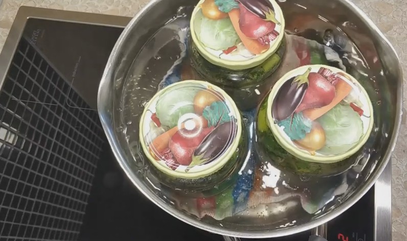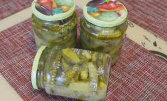 - Haal de komkommersalade van het vuur en verdeel deze direct over de potten. We doen ze in een grote pan op een handdoek en vullen met heet water tot aan het begin van de nek. Haal van het vuur 7 minuten na het koken.