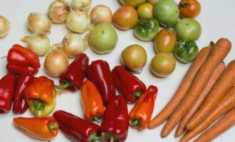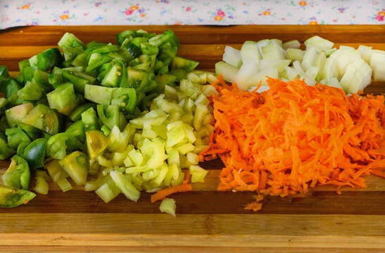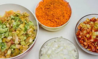 Rasp de wortelen. Snijd de uien, tomaten en paprika's in kleine stukjes.