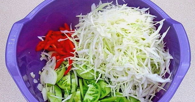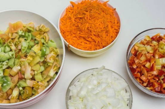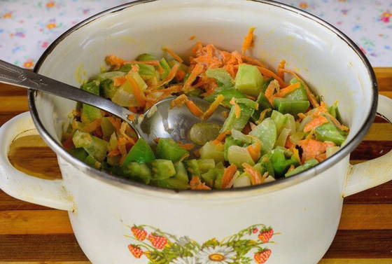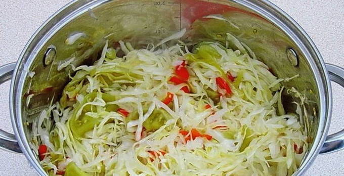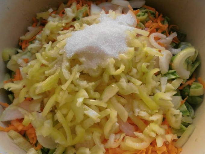 - Combineer gehakte groenten in een grote pan. Roer ze met suiker, zout, azijn en plantaardige olie. Laat de ingrediënten ongeveer 25-30 minuten op laag vuur sudderen.