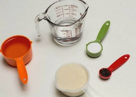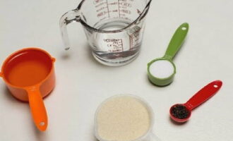 We meten de benodigde hoeveelheid suiker, zout, peper, azijn en plantaardige olie af.