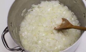We verwarmen een pan met plantaardige olie op het fornuis. We laten er enkele minuten gehakte uien in sudderen.