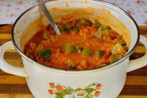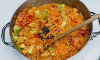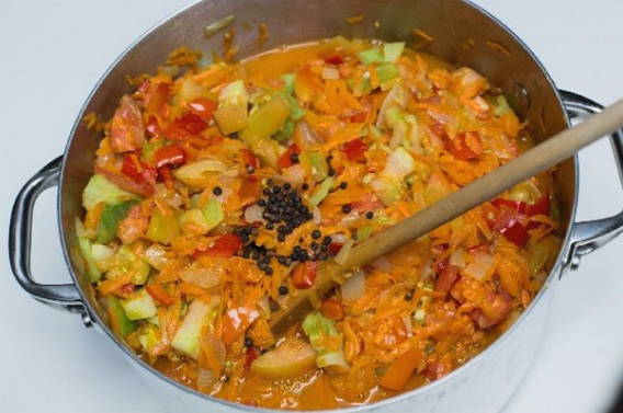 - Daarna zetten we de borden met de inhoud op het fornuis. Aanvullen met paprika, kruidnagel, laurierblaadjes en azijn. Laat de massa ongeveer 30 minuten op laag vuur sudderen.