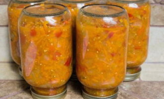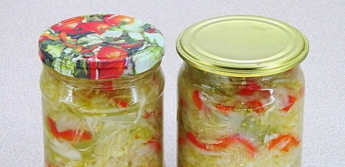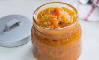 We gieten de voorbereide salade in schone en droge glazen potten. We sluiten de container met deksels en draaien hem ondersteboven totdat hij volledig is afgekoeld.