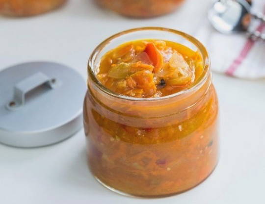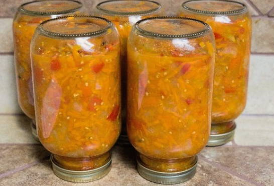 - Giet de afgewerkte salade samen met het sap in een glazen pot, gewassen met frisdrank en gebroeid. We sluiten de container af met een deksel en zetten hem voor langdurige opslag!