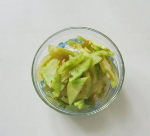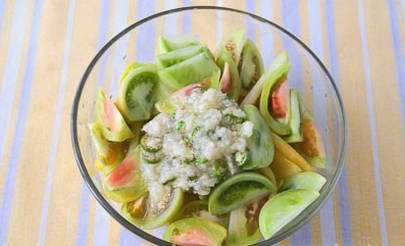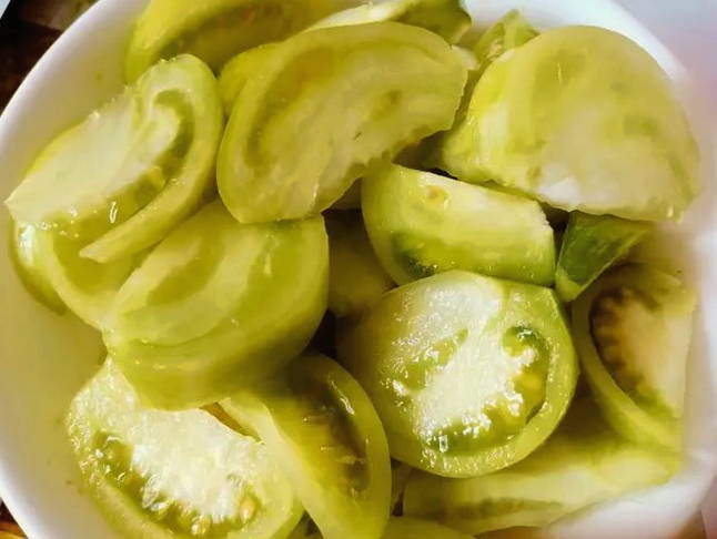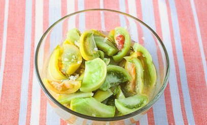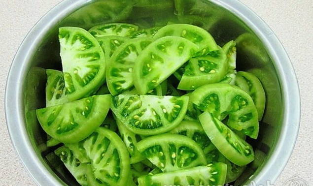 - Snijd de gewassen groene tomaten in kleine plakjes.