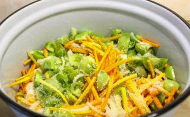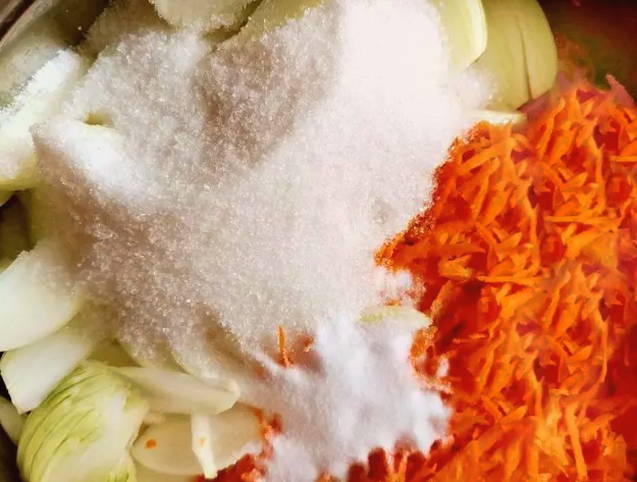 - Doe de gesneden groenten in een grote kom en bedek ze met suiker en zout.