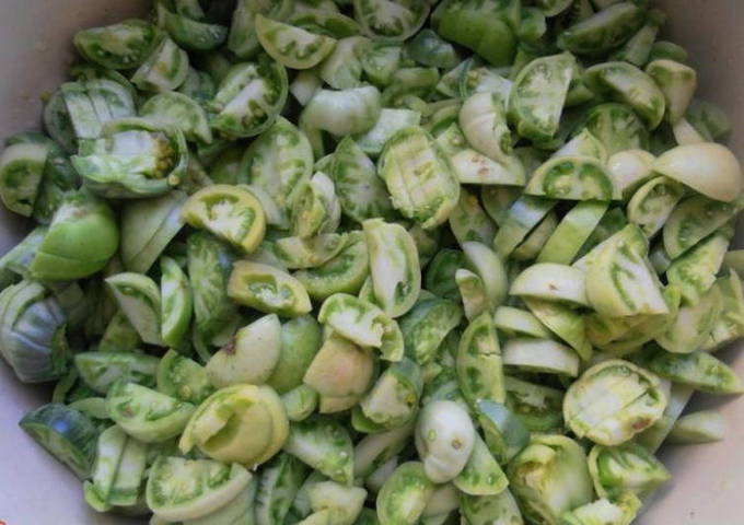 - Was de groene tomaten en snijd ze in kleine partjes.
