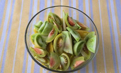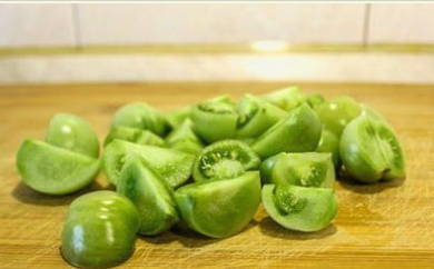 - We wassen de groene tomaten in koud water en verdelen ze vervolgens in kleine partjes.