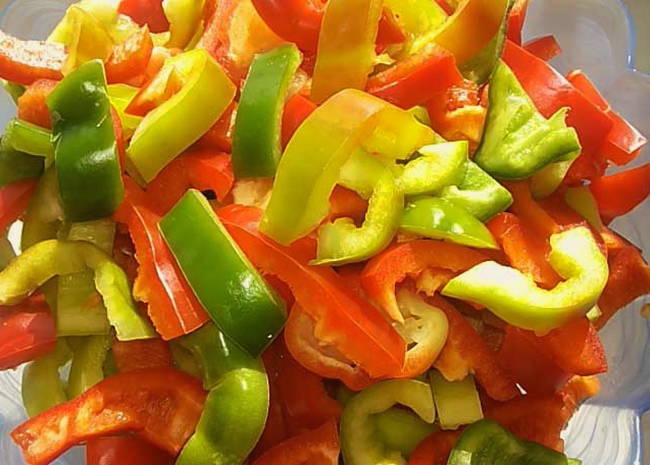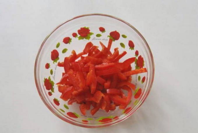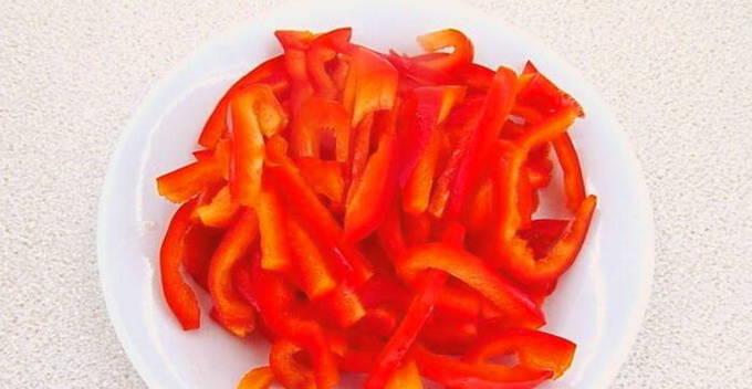 - We reinigen de paprika's van zaden en snijden ze in reepjes.