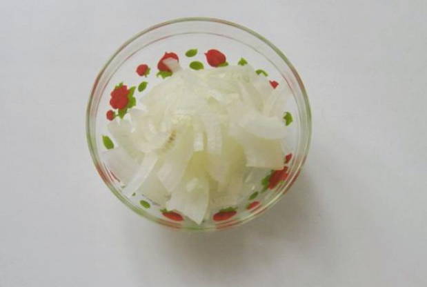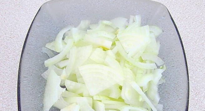 - Verwijder de schillen van de uien. Snijd de groente zelf in dunne halve ringen.