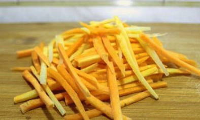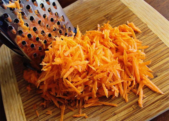 - Verwijder de schil van de wortelen. Daarna wrijven we de groente op een grove rasp of snijden we in dunne reepjes.