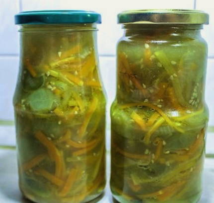 - Gedurende deze tijd zullen de producten veel sap geven. We brengen de salade met vloeistof over naar schone glazen potten. We sluiten de container met een deksel en nemen deze mee voor opslag. Klaar!